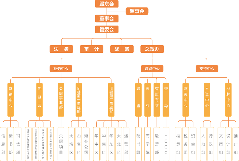 中膳設立“集團—區域—分子公司”三級架構網絡。全國共有3507名員工,其中管理層281名,一線員工3226名。