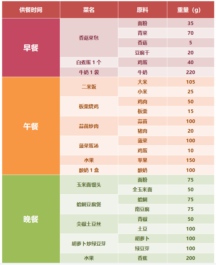在配餐和烹飪方面,制定合理團餐膳食配餐計劃。食物種類要符合《中國居民膳食指南》的推薦要求,優先采用減少營養成分損失和保持自然風味的食物烹飪方法,少用炸、煎、熏、烤等。每一餐食譜中提供至少3類食物,同類食物之間可進行品種互換(見表格)。