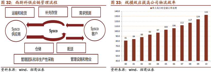 其四,SYSCO有強(qiáng)大的供應(yīng)鏈管理能力,保證物流效率。配送中心數(shù)量多,通過規(guī)模效應(yīng)降低了人力和物流成本,基本上是用ERP系統(tǒng)開展業(yè)務(wù)。產(chǎn)品十分豐富,可做到一站式服務(wù),同時涉獵食品和非食品,公司通過專業(yè)營銷與執(zhí)行,提升對客戶的滲透率與服務(wù)黏性。SYSCO銷售的毛利率基本上做到了18.7%,銷售凈利潤率做到了百分之二點(diǎn)多。