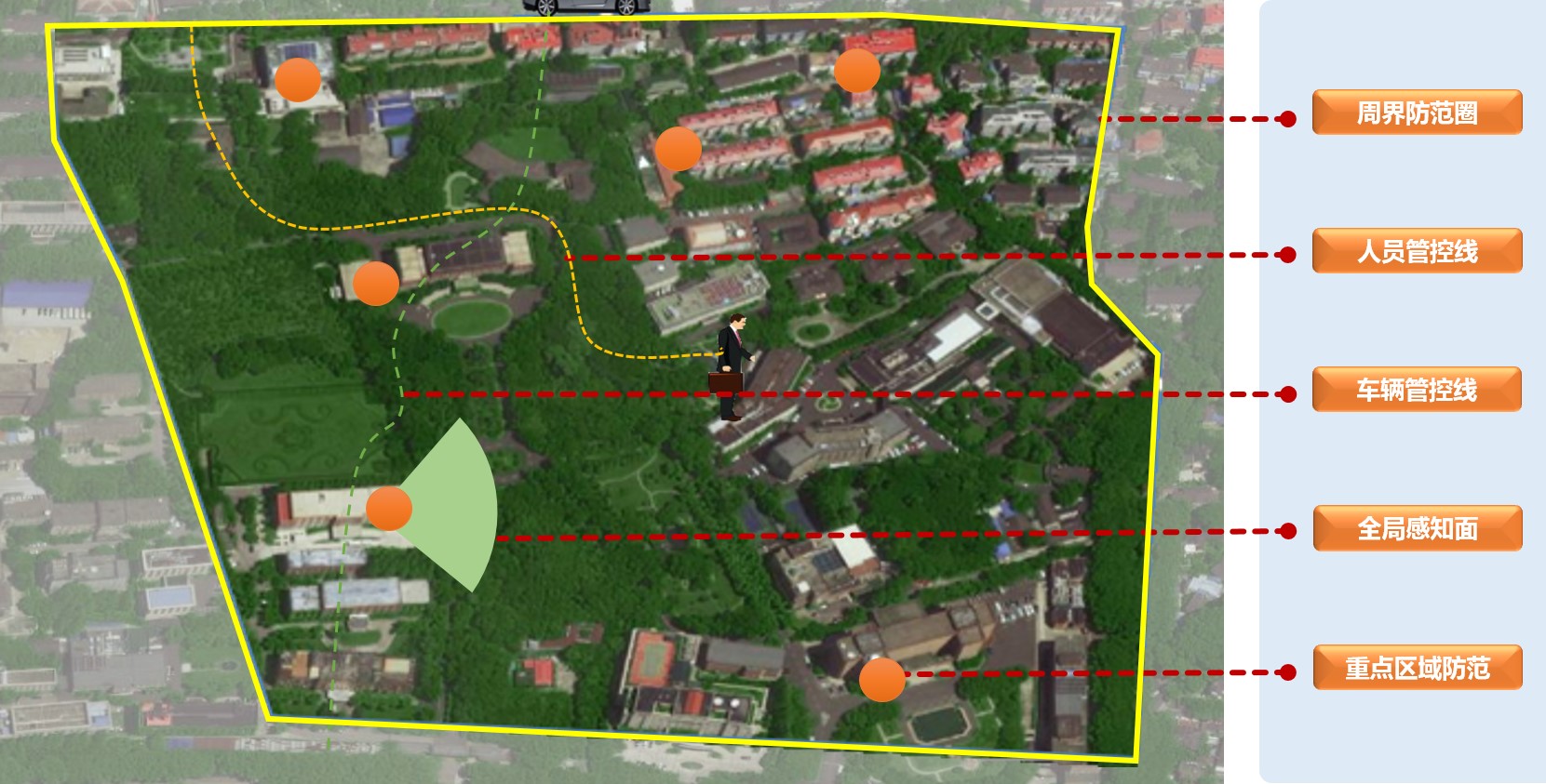 通過(guò)鷹眼攝像機(jī)在大樓制高點(diǎn)對(duì)校園進(jìn)行360度無(wú)死角的全景監(jiān)控,便于從全局掌握校園情況,同時(shí)能夠查看校內(nèi)監(jiān)控細(xì)節(jié),輔助學(xué)校及時(shí)、準(zhǔn)確地做出警情、火情的判斷、指揮和決策,構(gòu)建綜合安防校園內(nèi)全局態(tài)勢(shì)感知防控體系。